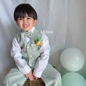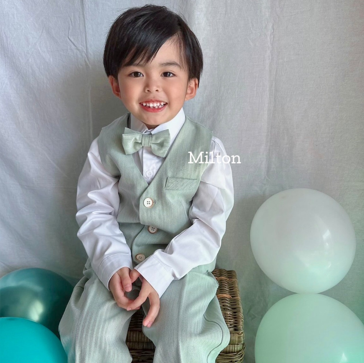 七五三や入園入学式などのセレモニーなどにぴったりな優しいグリーンの色味のジャケット+ベストスーツです。