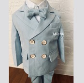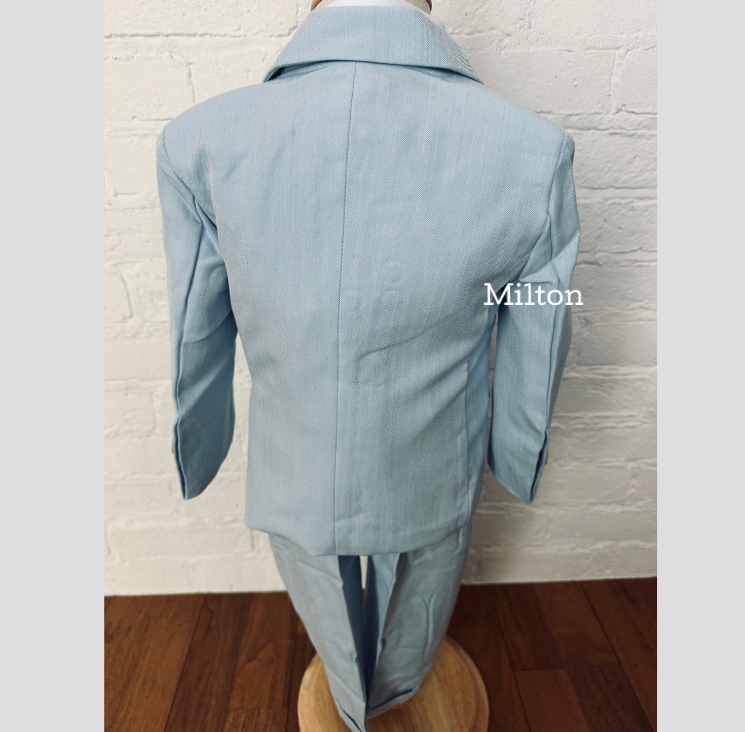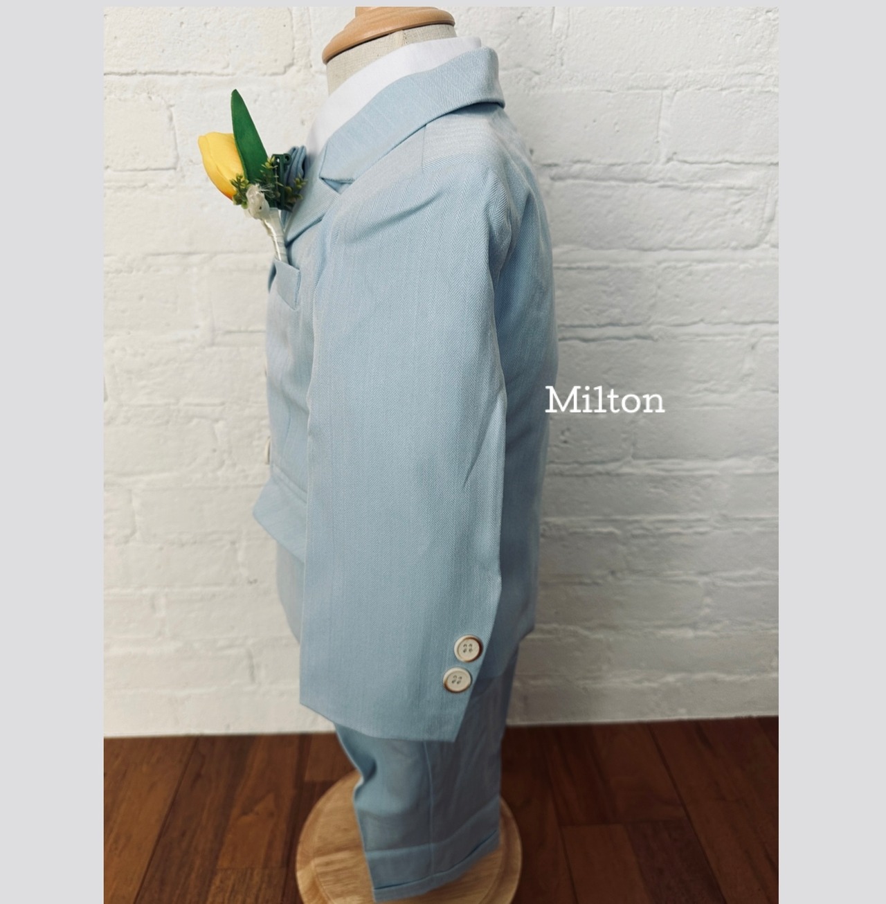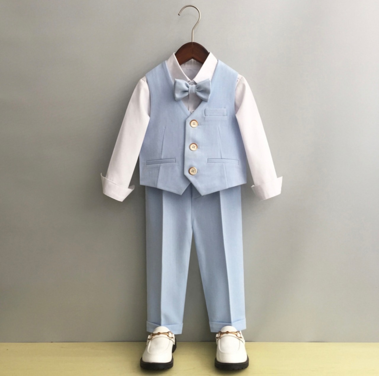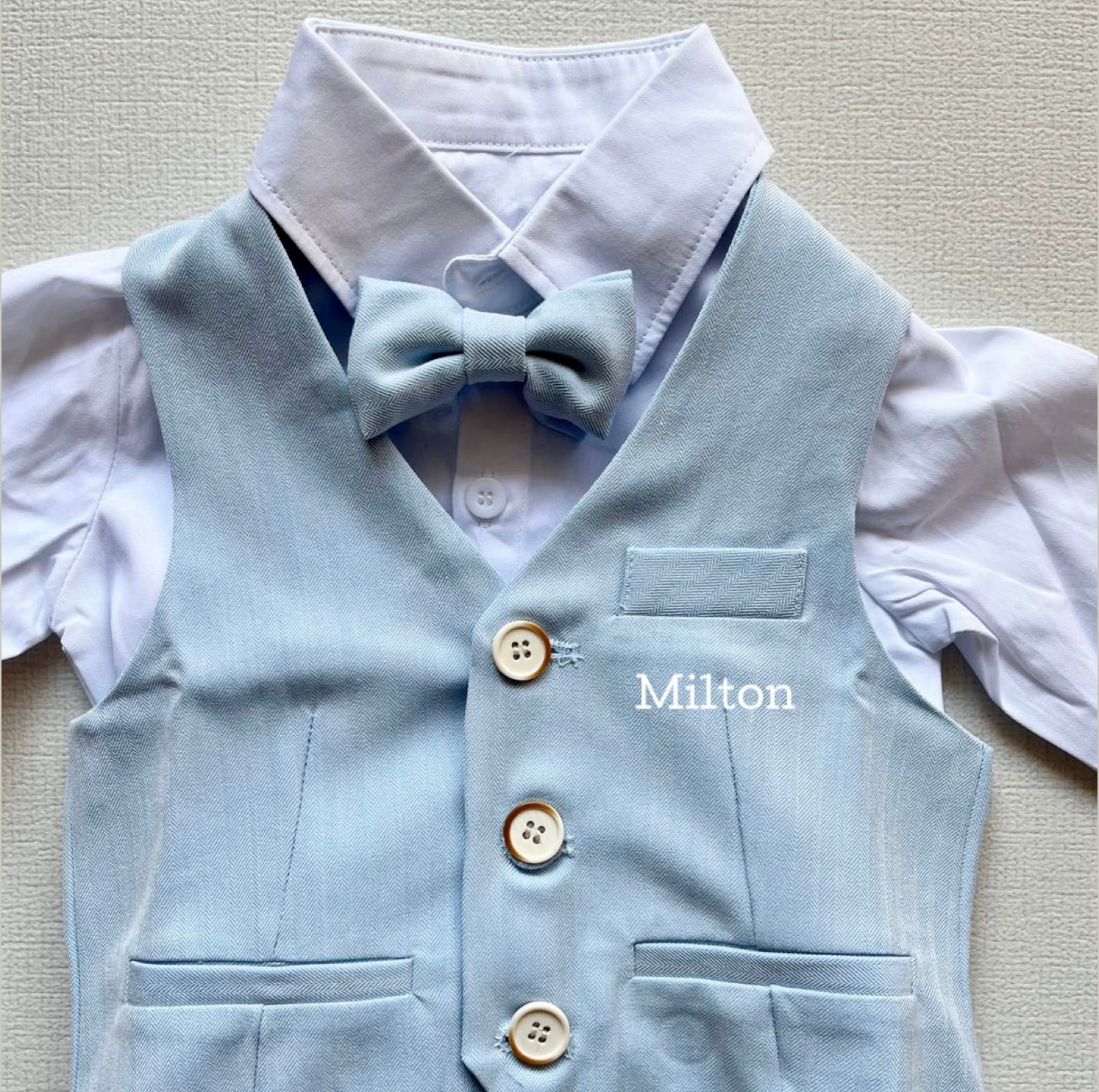 七五三や入園入学式などのセレモニーなどにぴったりな優しいブルーの色味のジャケット+ベストスーツです。