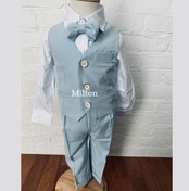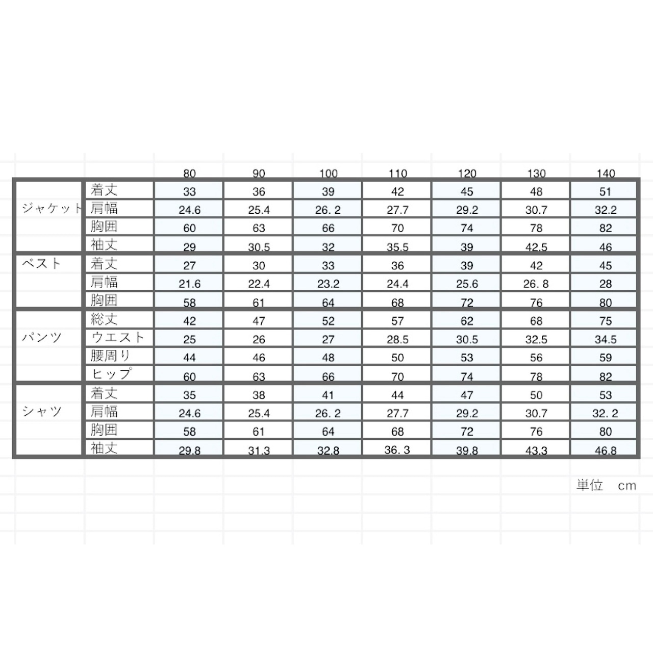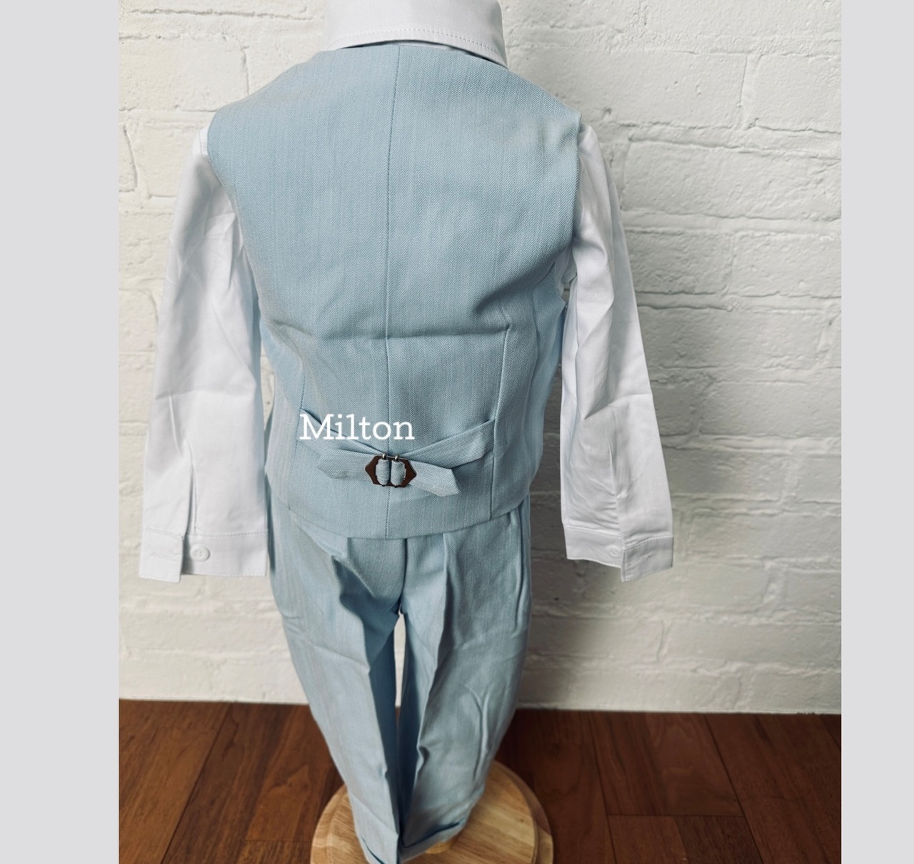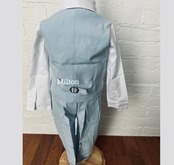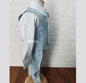 七五三や入園入学式などのセレモニーなどにぴったりな優しいブルーの色味のベストスーツです。