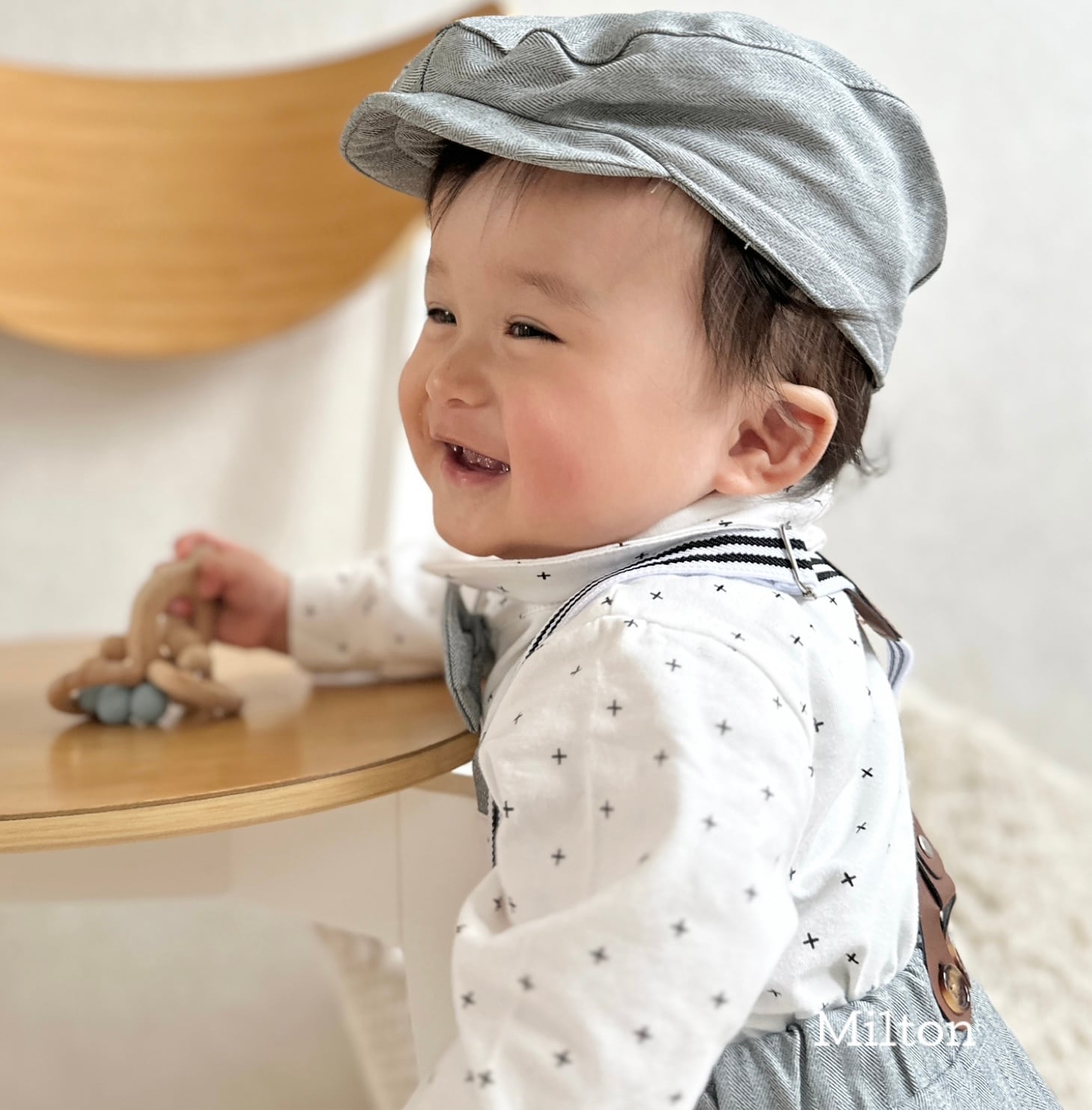 落ち着いたグレーの色味のハット付きロンパースタイプのセットアップ。