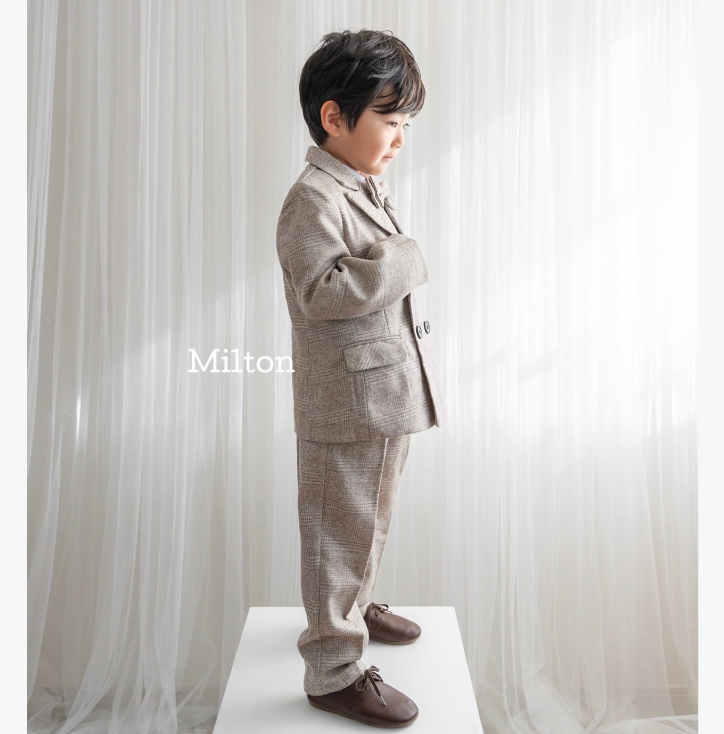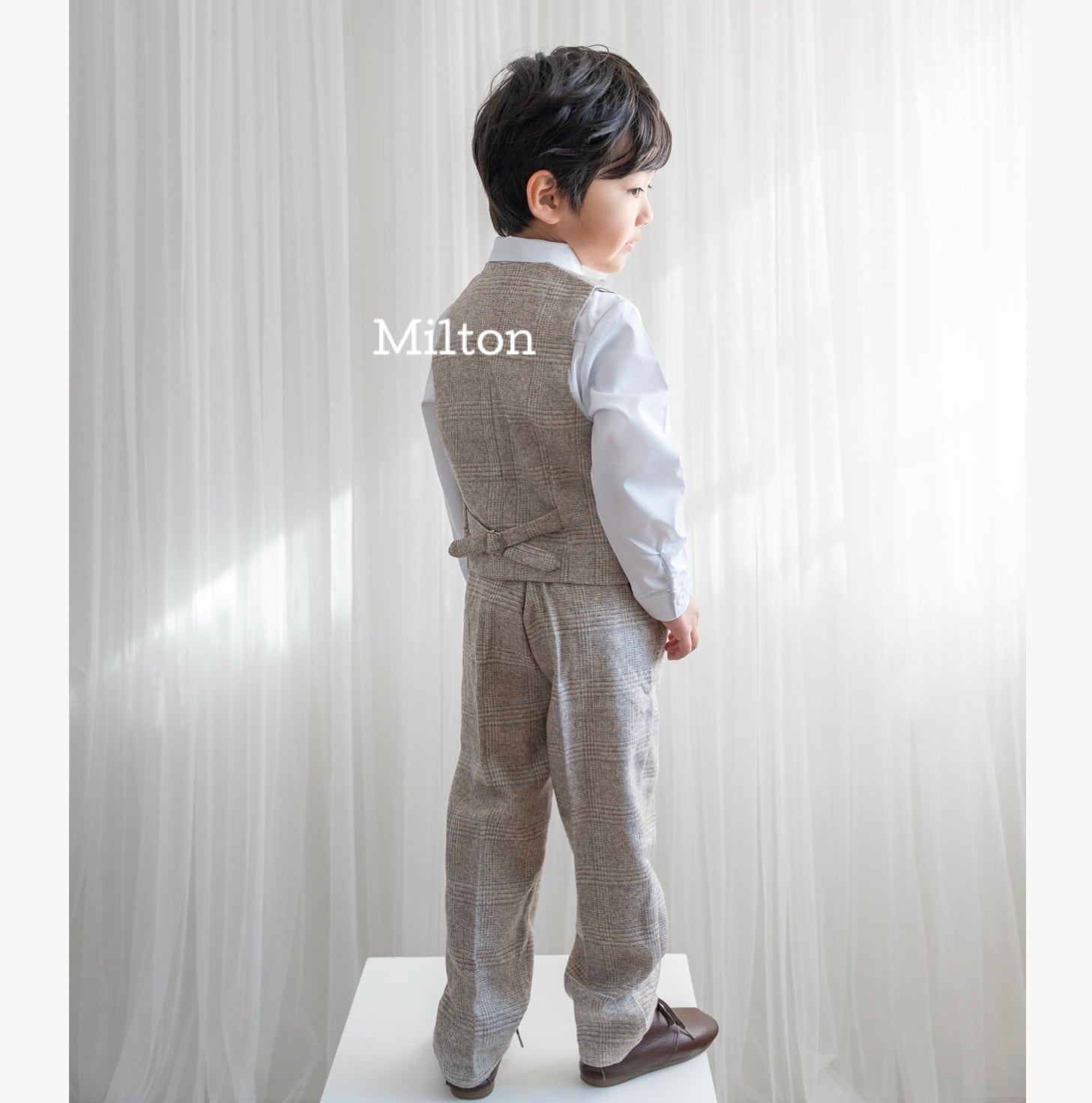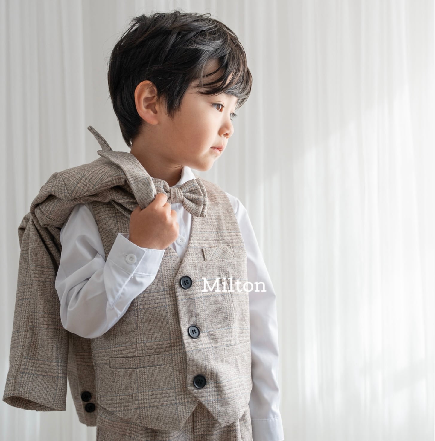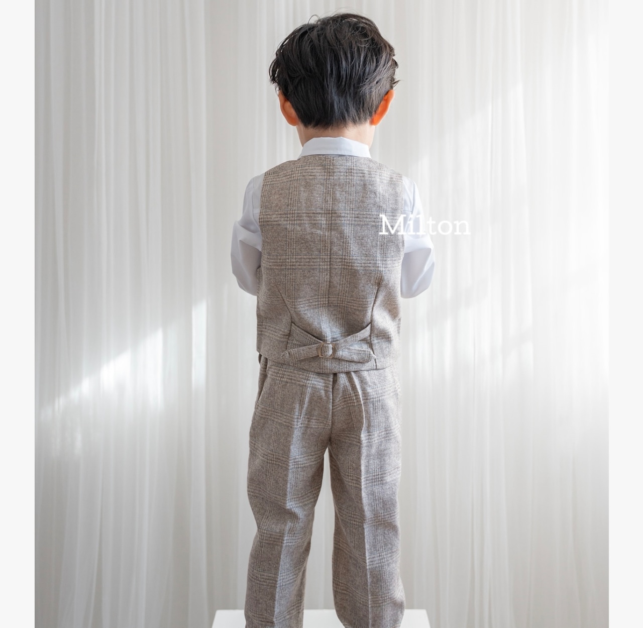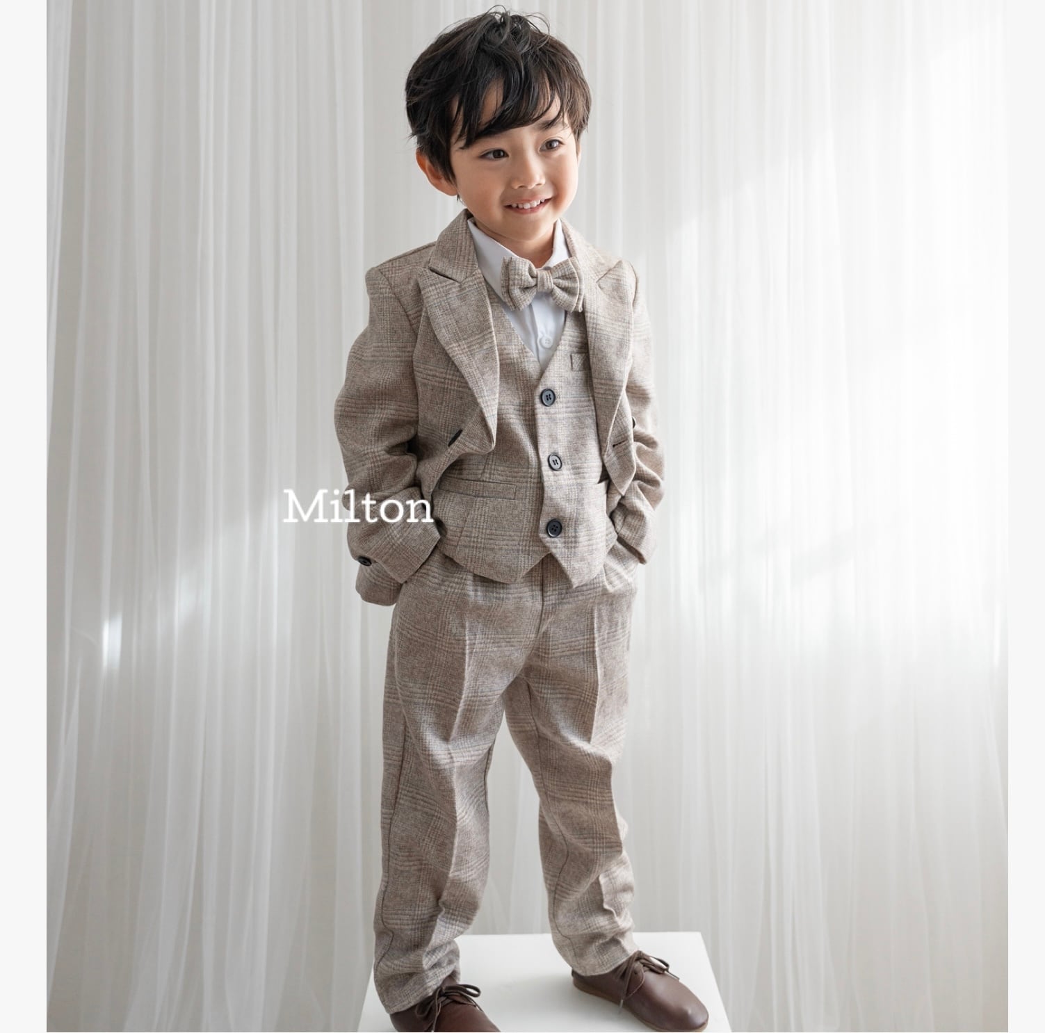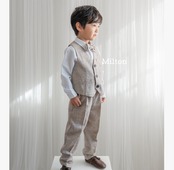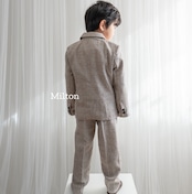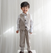 結婚式や入園入学式などのセレモニーなどにぴったりなの色味のジャケット+ベストスーツです。